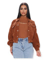 The Chestnut Corduroy Bomber Jacket is perfect for showing off your figure. It cuts at your waistline. The arms have a baggy effect. Material: 100% cotton